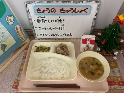 豚肉のしょうが焼き、さつまいものみそ汁、きくなとはくさいのごまあえ、ごはん、牛乳
