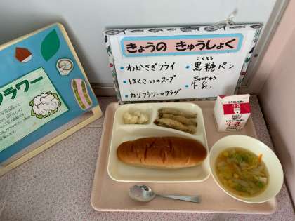 わかさぎフライ、はくさいのスープ、カリフラワーのサラダ、黒糖パン、牛乳