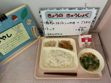 豚肉の子コチジャンいため、トック、もやしのナムル、ごはん、牛乳