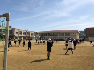 運動場では、子どもたちが元気に遊んでいます。天気もとても良く過ごしやすい日です。