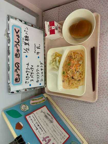 さけのクリームスパゲッティ、カリフラワーとコーンのサラダ、黒糖クレセントロールパン、牛乳
