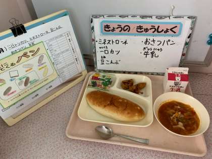 一口とんかつ、ミネストローネ、豆こんぶ、おさつパン、牛乳