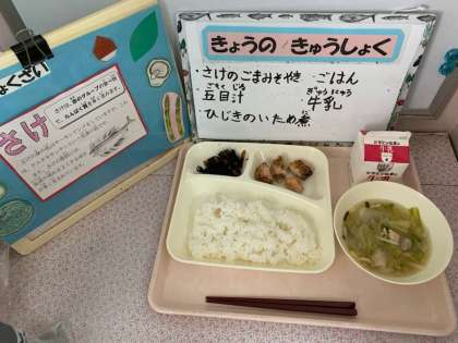 さけのごまみそ焼き、五目汁、ひじきのいため煮、ごはん、牛乳