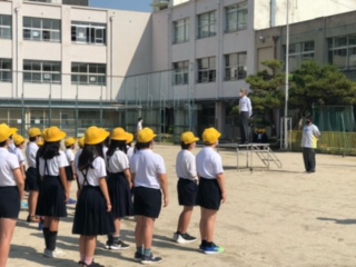 →久しぶりに全校朝会が運動場にて行われました。月曜日より通常授業が再開されています。引き続き体調に気をつけていきましょう。