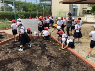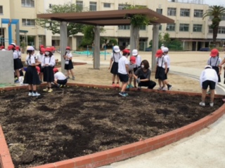 →3年生が学習園で植え込みの作業をしていました。みんなで協力して、丁寧に植えている姿が印象的でした。元気に大きく育つといいですね。このあとのお手入れも引き続き頑張りましょう。