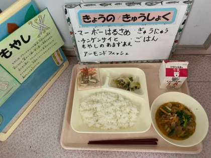 マーボーはるさめ、チンゲンサイともやしの甘酢あえ、アーモンドフィッシュ、ごはん、牛乳