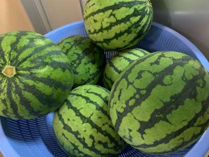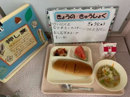 鶏肉と夏野菜のソテー、押し麦のスープ、すいか、黒糖パン、牛乳