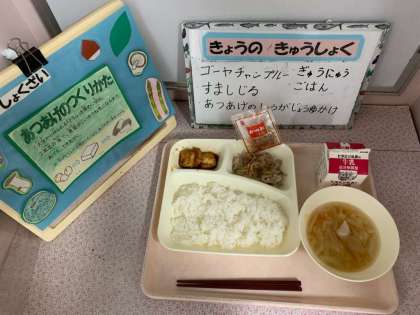 ゴーヤチャンプルー、すまし汁、あつあげのしょうがじょうゆかけ、ごはん、牛乳