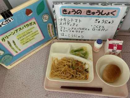 チキントマトスパゲッティ、グリーンアスパラガスとキャベツのサラダ、発酵乳、黒糖クレセントロールパン、牛乳