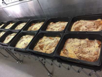かぼちゃのミートグラタン、スープ、オレンジ、黒糖パン、牛乳