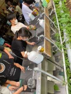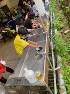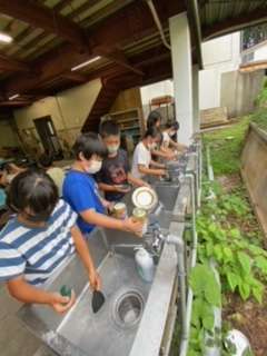 ススがついて真っ黒になった鍋や飯盒を、ピカピカに磨きます。