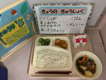 肉じゃが、あつあげのみそだれかけ、あっさりきゅうり、ごはん、牛乳