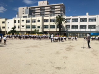 →地震の避難に続いて、津波に対する避難訓練を行いました。校舎の3階以上に避難をしました。(※今回の想定は3メートルのため)想定を超える高さの場合の避難場所は「丸善インテックアリーナ大阪」屋上緑地部としています。