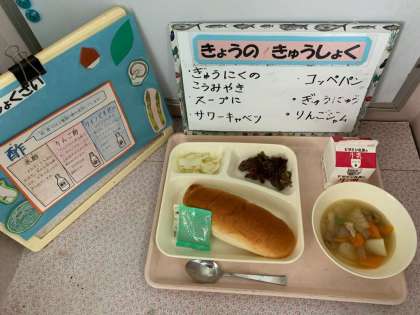 牛肉の香味焼き、スープ煮、サワーキャベツ、りんごジャム、牛乳