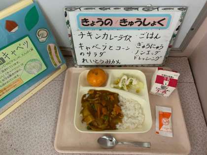 チキンカレーライス(米粉)、キャベツとコーンのサラダ(ノンエッグドレッシング)、みかん(冷)牛乳