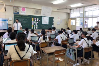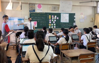 →「円の面積」の学習に取り組んでいました。円の一部を含む複雑な形の面積を工夫して求めました。