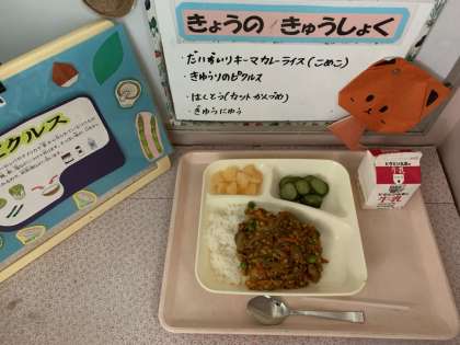 大豆入りキーマカレーライス(米粉)、きゅうりのピクルス、白桃(カット缶)、牛乳