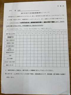 今日は早めに休んで楽しい思い出を作りましょう!健康観察プリントを忘れずに!!