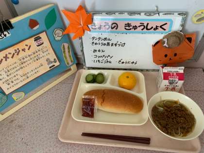 タンタンめん、きゅうりの甘酢づけ、みかん、コッペパン、いちごジャム、牛乳