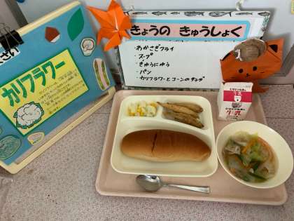 わかさぎフライ、スープ、カリフラワーとコーンのサラダ、黒糖パン、牛乳