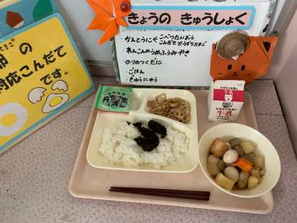 関東煮、れんこんの梅風味焼き、のりのつくだ煮、ソフト黒豆、ごはん、牛乳
