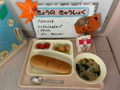 さけのマリネ、肉だんごと麦のスープ、プチトマト、黒糖パン、牛乳