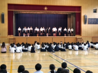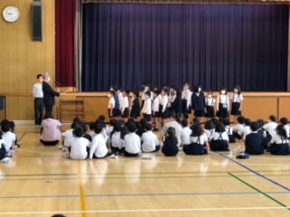 本日の児童集会にて、前期代表委員の挨拶がありました。学級代表や各委員会の委員長は、田中小学校を笑顔で明るい学校にするために、頑張りたいと言ってくれました。とても頼もしくカッコイイ姿でした。これからの活動での活躍が楽しみです。