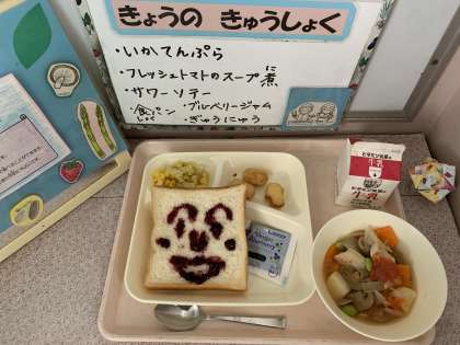 いかてんぷら、フレッシュトマトのスープ煮、サワーソテー、食パン、ブルーベリージャム、牛乳
