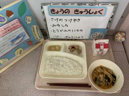 さけのつけ焼き、みそ汁、とうがんの煮もの、ごはん、牛乳