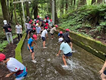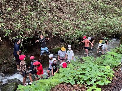 さぁ、お待ちかねの魚つかみ、沢登りです!めちゃ冷たい川の水に入り、楽しんでます!
