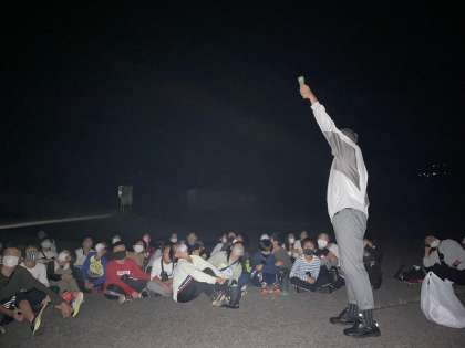 校長先生に星の話をしていただいています。霧が少しはれてきました。