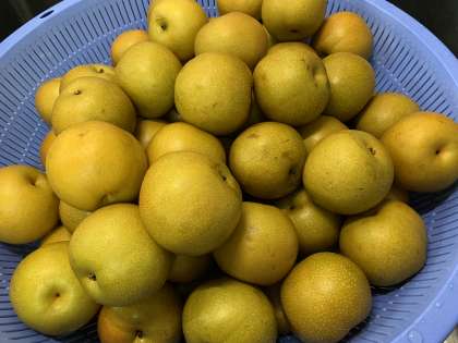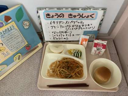 イタリアンスパゲッティ、グリーンアスパラガスのサラダ〔ノンエッグドレッシング]、なし(豊水)、黒糖クレセントロールパン、牛乳