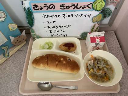 とんかつのオーロラソースかけ、スープ、あっさりキャベツ、おさつパン、牛乳