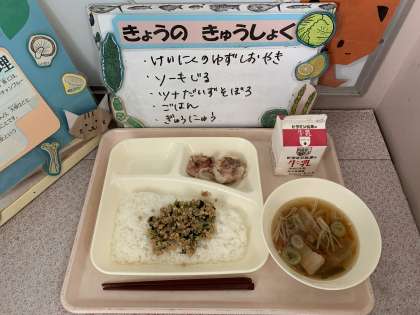 鶏肉のゆず塩焼き、ソーキ汁、ツナ大豆そぼろ、ごはん、牛乳