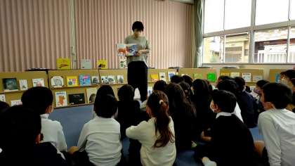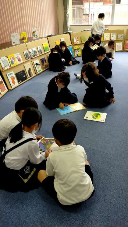 今日、明日と2日間を使って、全学年順番に「えほんひろば」を行っています。