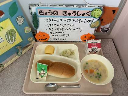 豆乳コーンクリームシチュー[米粉]、はくさいのピクルス、かき(平核無柿)、コッペパン、ソフトマーガリン、牛乳