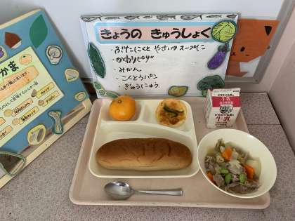 豚肉と野菜のスープ煮、変わりピザ、みかん、黒糖パン、牛乳