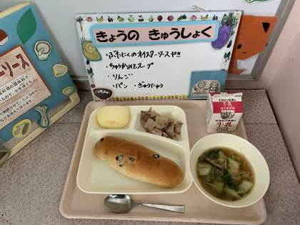 豚肉のオイスターソース焼き、中華みそスープ、りんご、レーズンパン、牛乳
