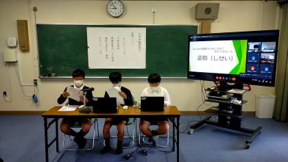 土曜参観の1時間目に行った「学校保健委員会」では、保健委員会の児童が「姿勢」の大切さについて発表しました。姿勢をよくする運動も紹介して、4年生以上の全員で取り組みました。