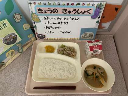 豚肉と野菜のいためもの、いわしのつみれ汁、かぼちゃういろう、ごはん、牛乳