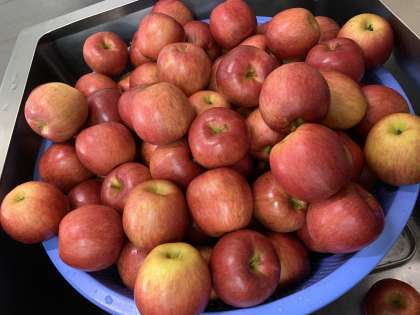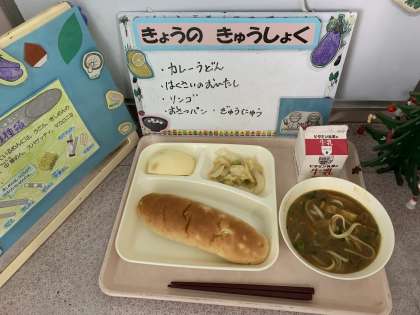カレーうどん、はくさいのおひたし、りんご、おさつパン、牛乳