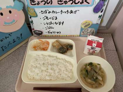 さばのカレーたつたあげ、五目汁、紅白なます、ごはん、牛乳