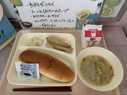 わかさぎフライ、コーンとはくさいのスープ、カリフラワーのサラダ、コッペパン、ブルーベリージャム、牛乳