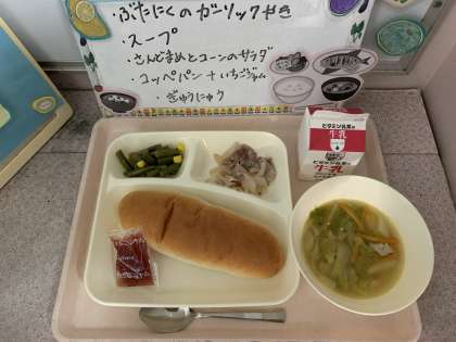 豚肉のガーリック焼き、スープ、さんどまめとコーンのサラダ、コッペパン、いちごジャム、牛乳