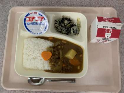 牛肉と大豆のカレーライス、キャベツのひじきドレッシング、ヨーグルト、牛乳