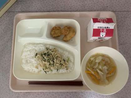 白身魚のフリッター、すまし汁、とりなっ葉いため、ごはん、牛乳