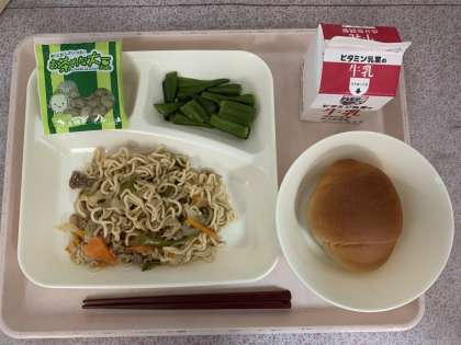 和風焼きそば、オクラの甘酢あえ、まっ茶大豆、黒糖クレセントロールパン、牛乳