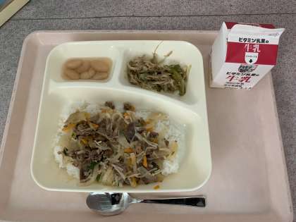 牛丼、もやしとピーマンのごまいため、大福豆の煮もの、牛乳