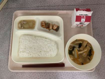 さけのつけ焼き、みそ汁、とうがんの煮もの、ごはん、牛乳