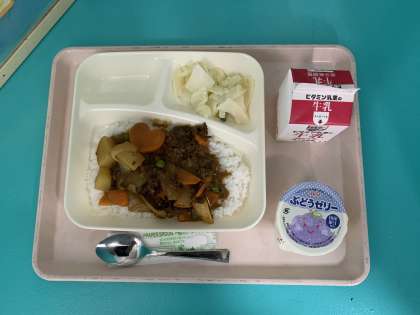 ビーフカレーライス[米粉]、野菜のピクルス、ぶどうゼリー、牛乳